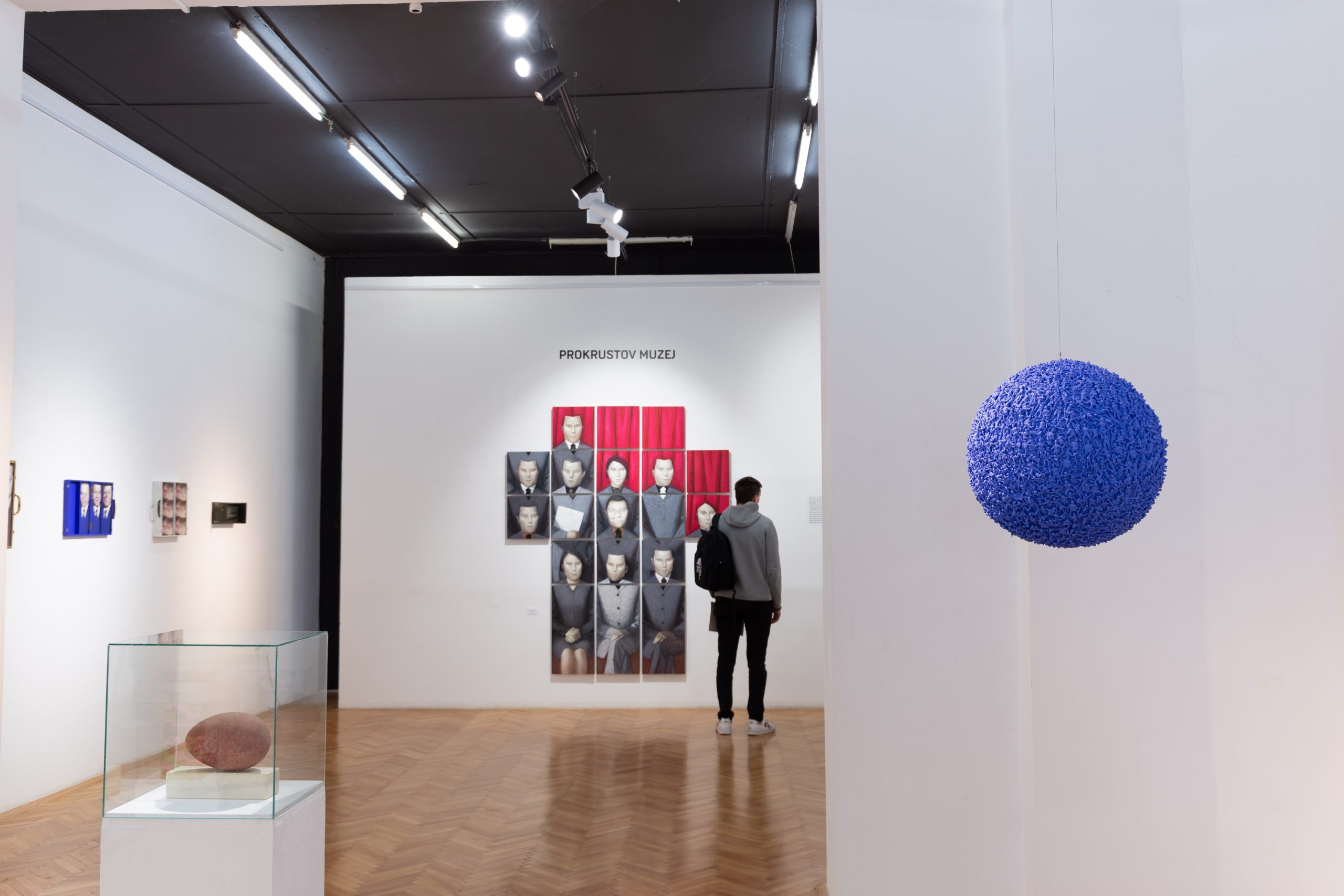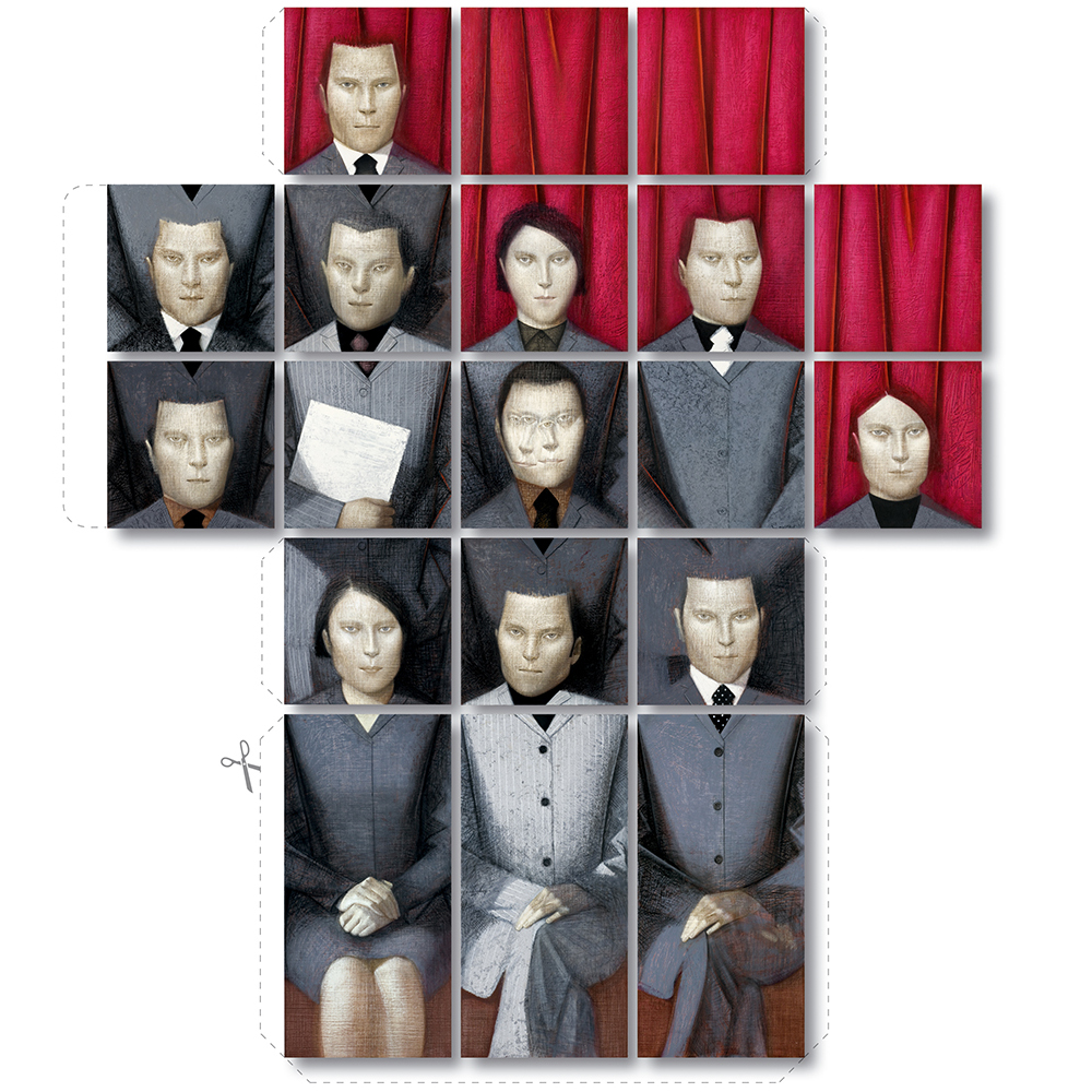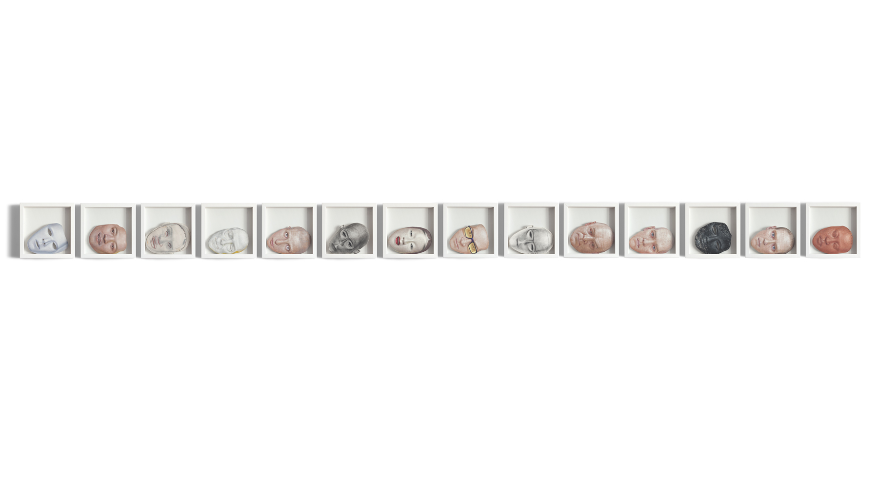 14 self-portraits of artist Vladimir Dunjic, 2015. Oil acrylic on canvas, wood, 420 x 28 cm