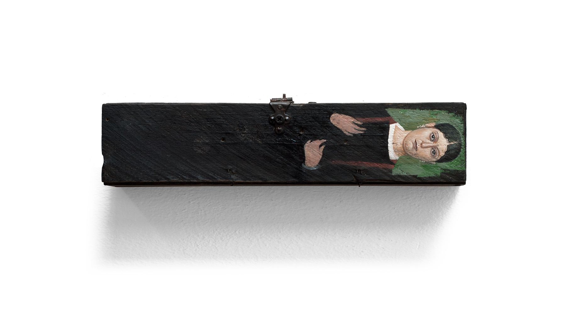 Bradley Manning, 2024. ulje akrilik na platnu, drvo, metal 11 x 33 x 6 cm