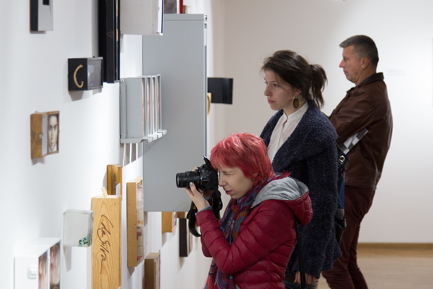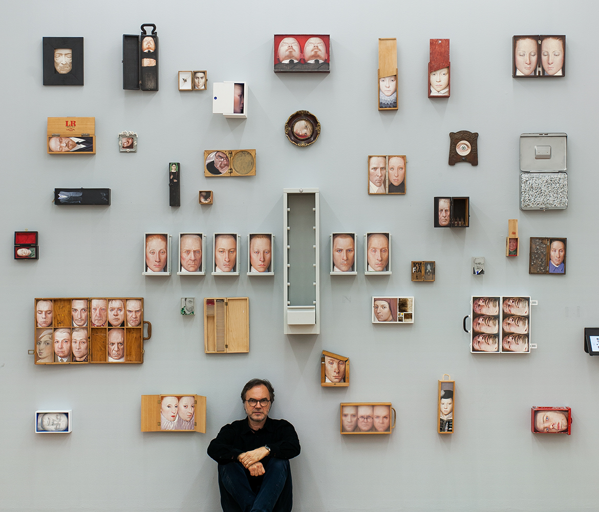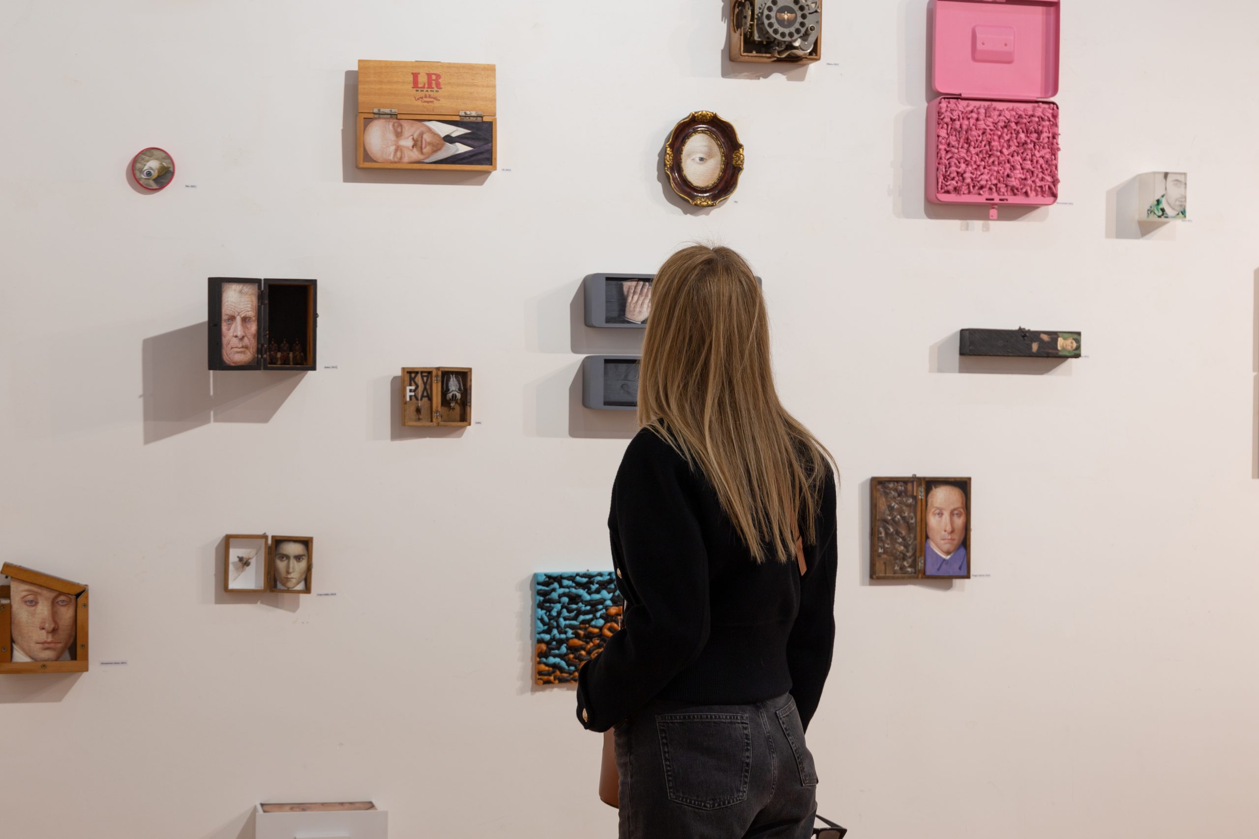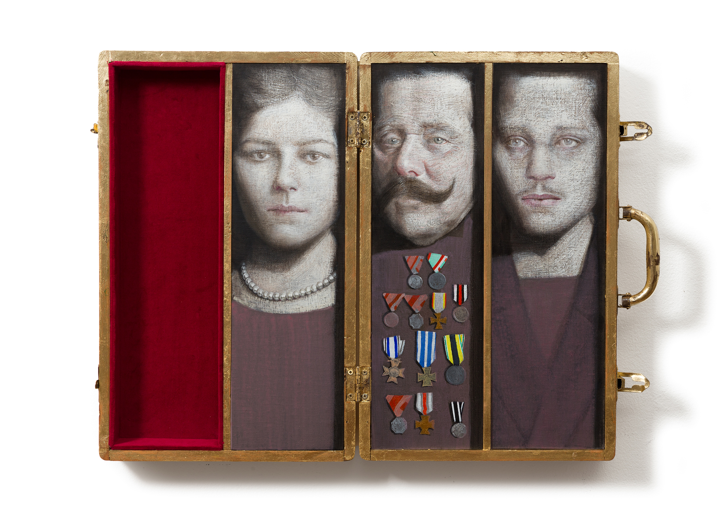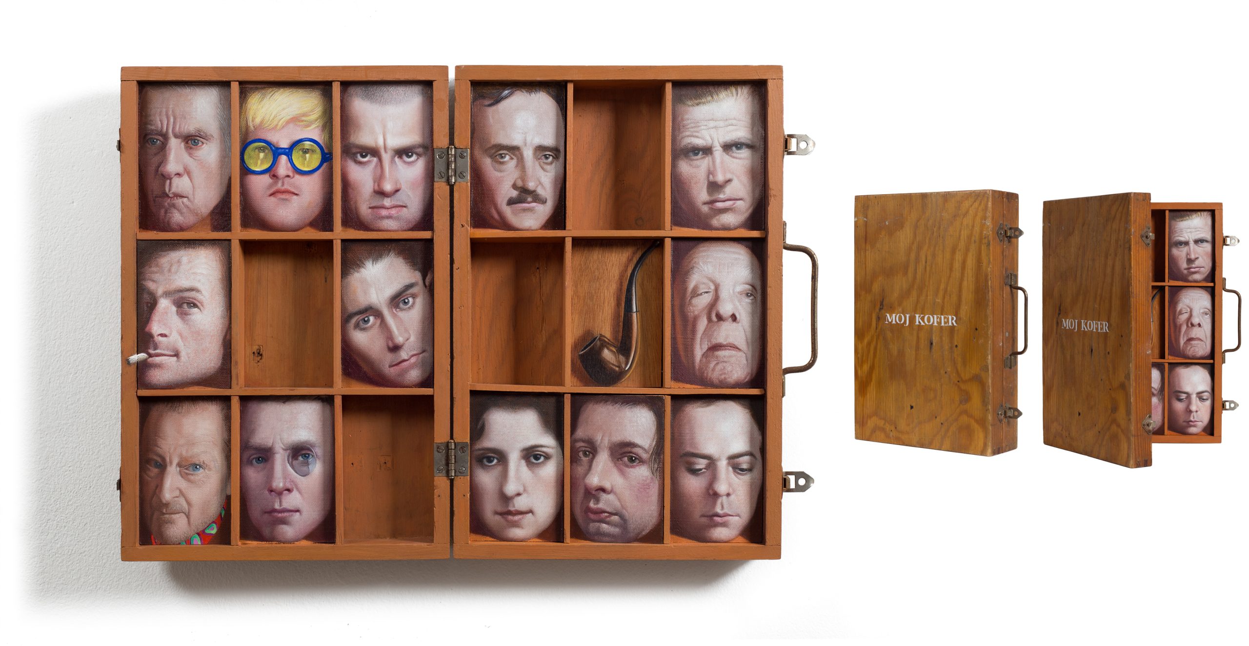 MOJ KOFER, 2024. Ulje akrilik na platnu, daska, metal 37 x 53 x 6 cm Moji idoli iz mladosti redom s leva na desno: 1. Ron Mueck, 2. David Hockney, 3. Владимир Маяковский, 4. Balthus, 6. Franz Kafka, 7. Lucian Freud, 8. Mihail Bulgakov, 10. Edgar Allan Poe, 12. Otto Dix, 14. René Magritte, 15. Jorge Luis Borges, 16. Milena Pavlović Barili, 17. Giorgio de Chirico, 18. Leonid Šejka -