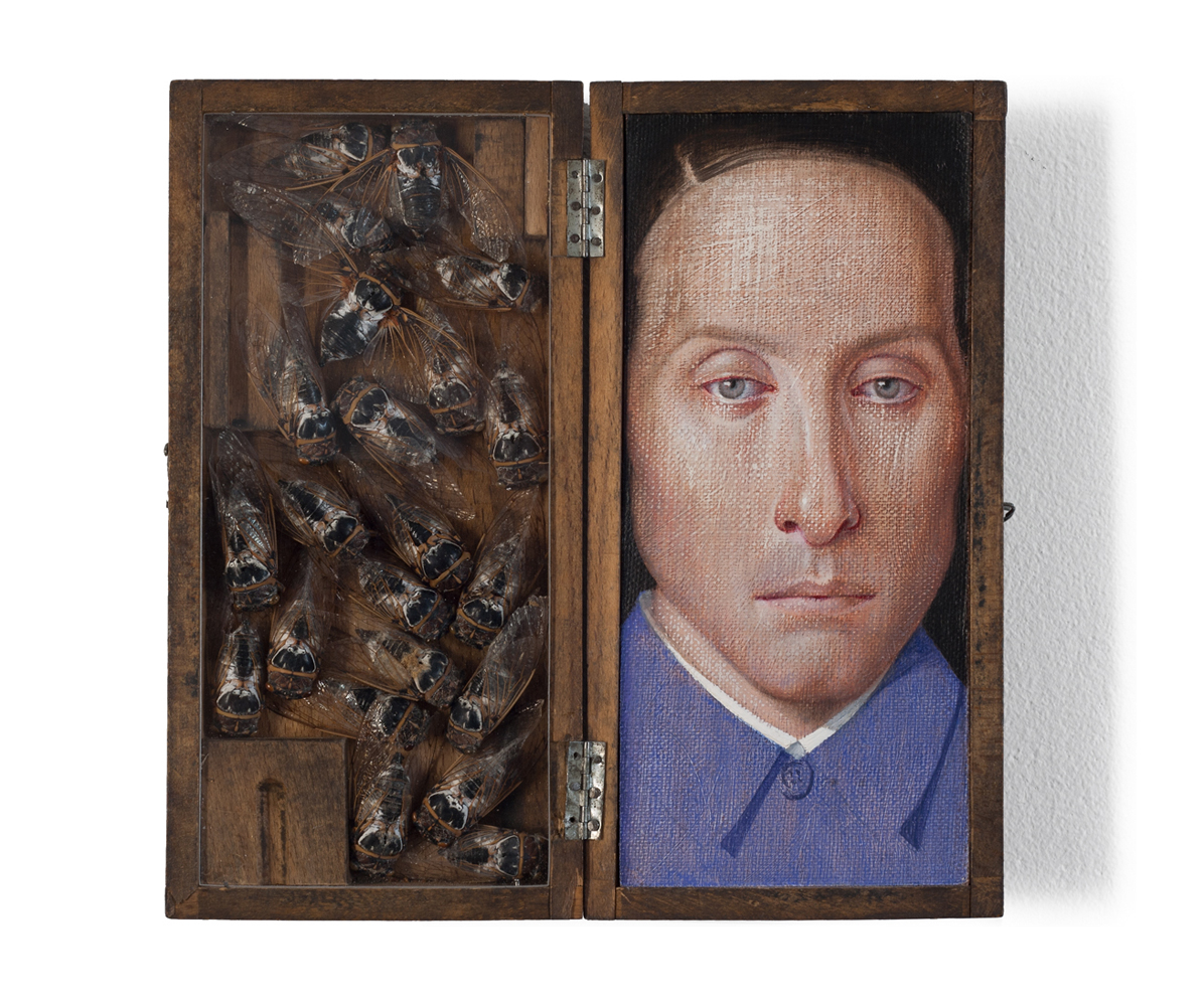 Gregor Samsa, 2013. Oil acrylic on canvas, taxidermied crickets, 17.5x18x2.5