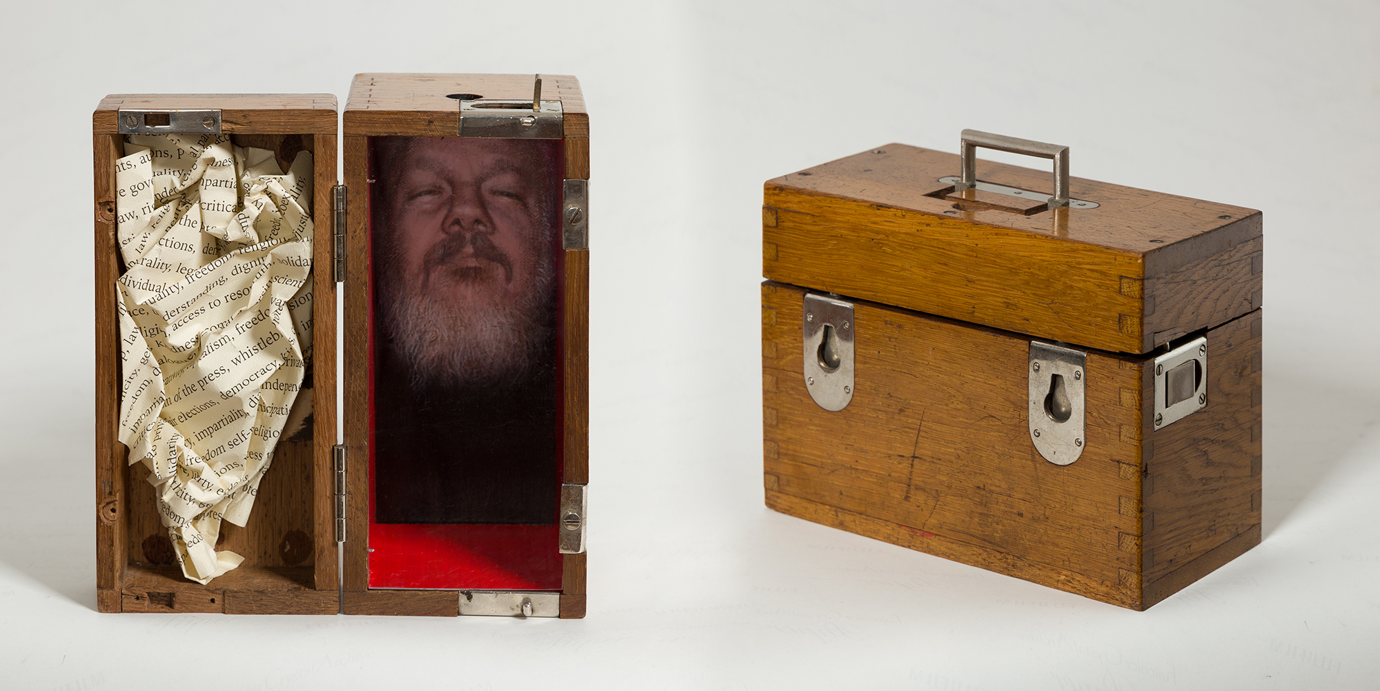 A tribute to Julian Assange, 2023. Oil acrylic on canvas, wood, metal 21 x 20 x 11 cm