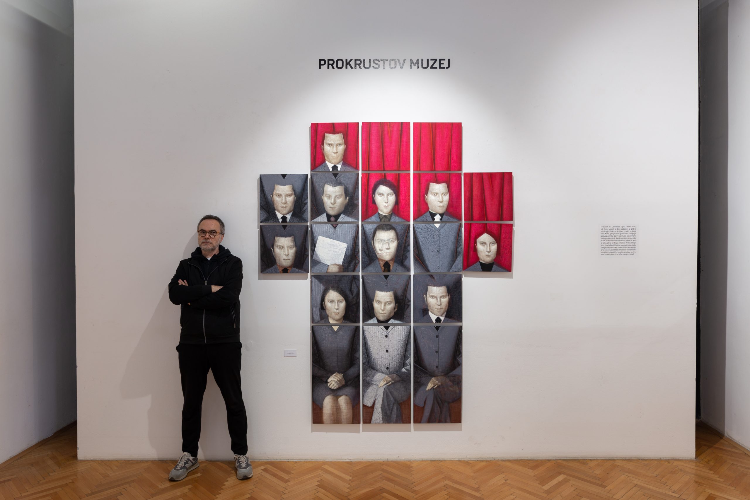 MOJ KOFER, 2024. Ulje akrilik na platnu, daska, metal 37 x 53 x 6 cm Moji idoli iz mladosti redom s leva na desno: 1. Ron Mueck, 2. David Hockney, 3. Владимир Маяковский, 4. Balthus, 6. Franz Kafka, 7. Lucian Freud, 8. Mihail Bulgakov, 10. Edgar Allan Poe, 12. Otto Dix, 14. René Magritte, 15. Jorge Luis Borges, 16. Milena Pavlović Barili, 17. Giorgio de Chirico, 18. Leonid Šejka
