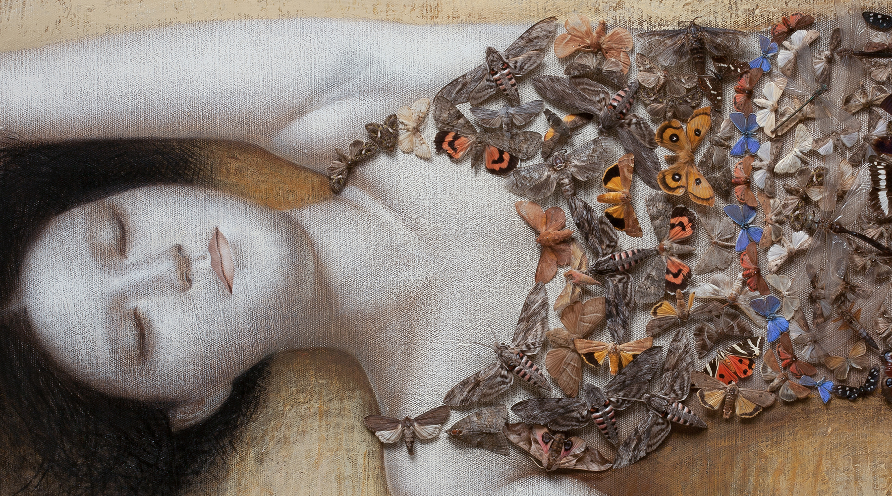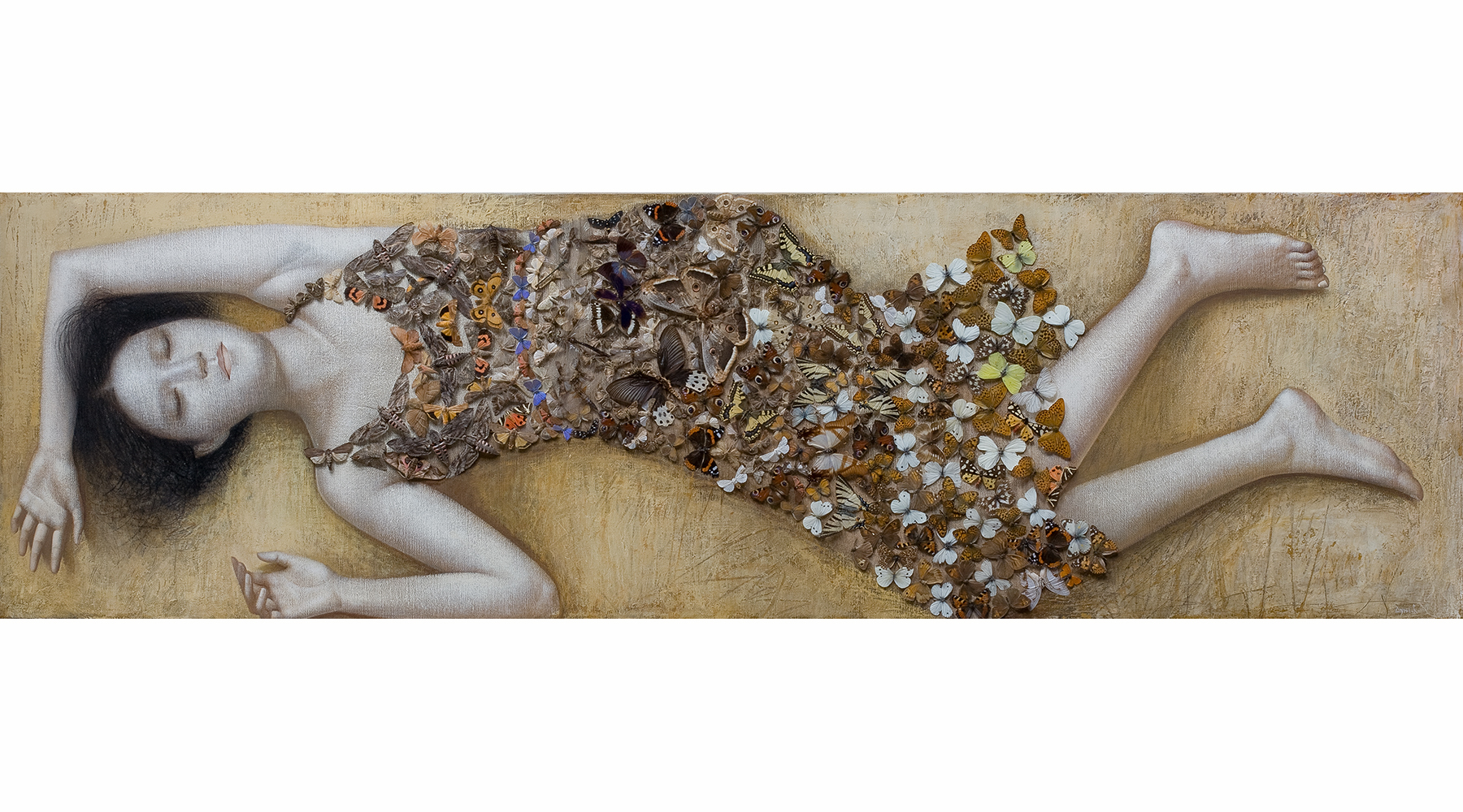 • Euridika, 2007. ulje akrilik na platnu, preparirani leptiri, 50 x 170 cm
